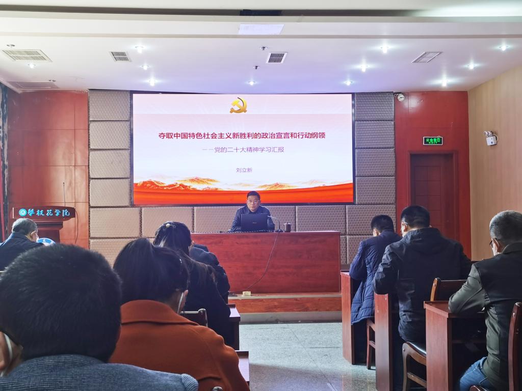 1月11日下午,党委常委、副校长刘立新在办公楼416作党的二十大精神宣讲报告。计财处、资管处、教务处、公共实验中心、基础医学院、康养学院师生代表认真聆听了此次报告。