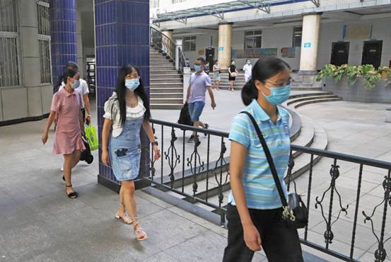学生排队入住寝室时,公寓管理员再次检测体温、核验信息,讲解防控注意事项。