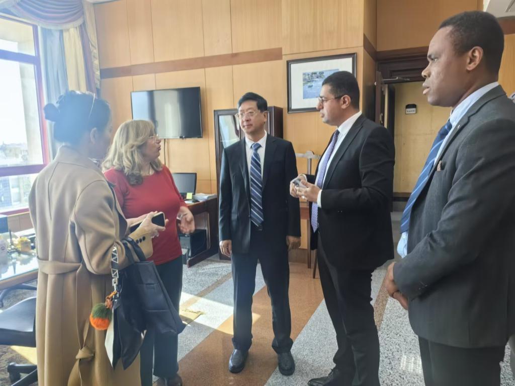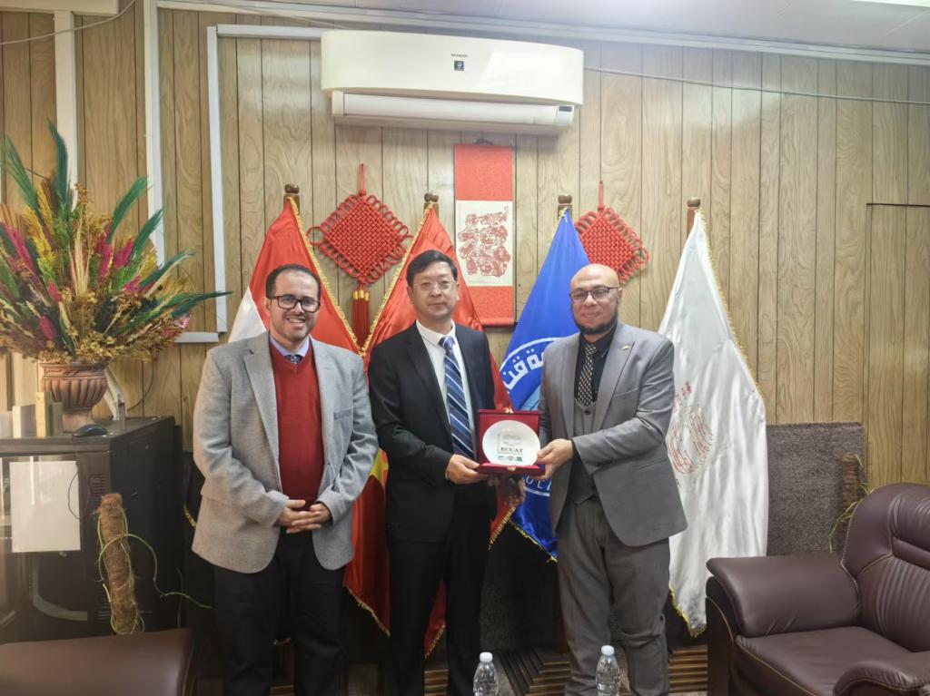 在埃及中国大学,代表团与学校国际交流与合作处、艺术学院、工程学院负责人进行了交流,双方就进一步加强在人才培养、技术沟通、学术交流等方面的合作达成意向。