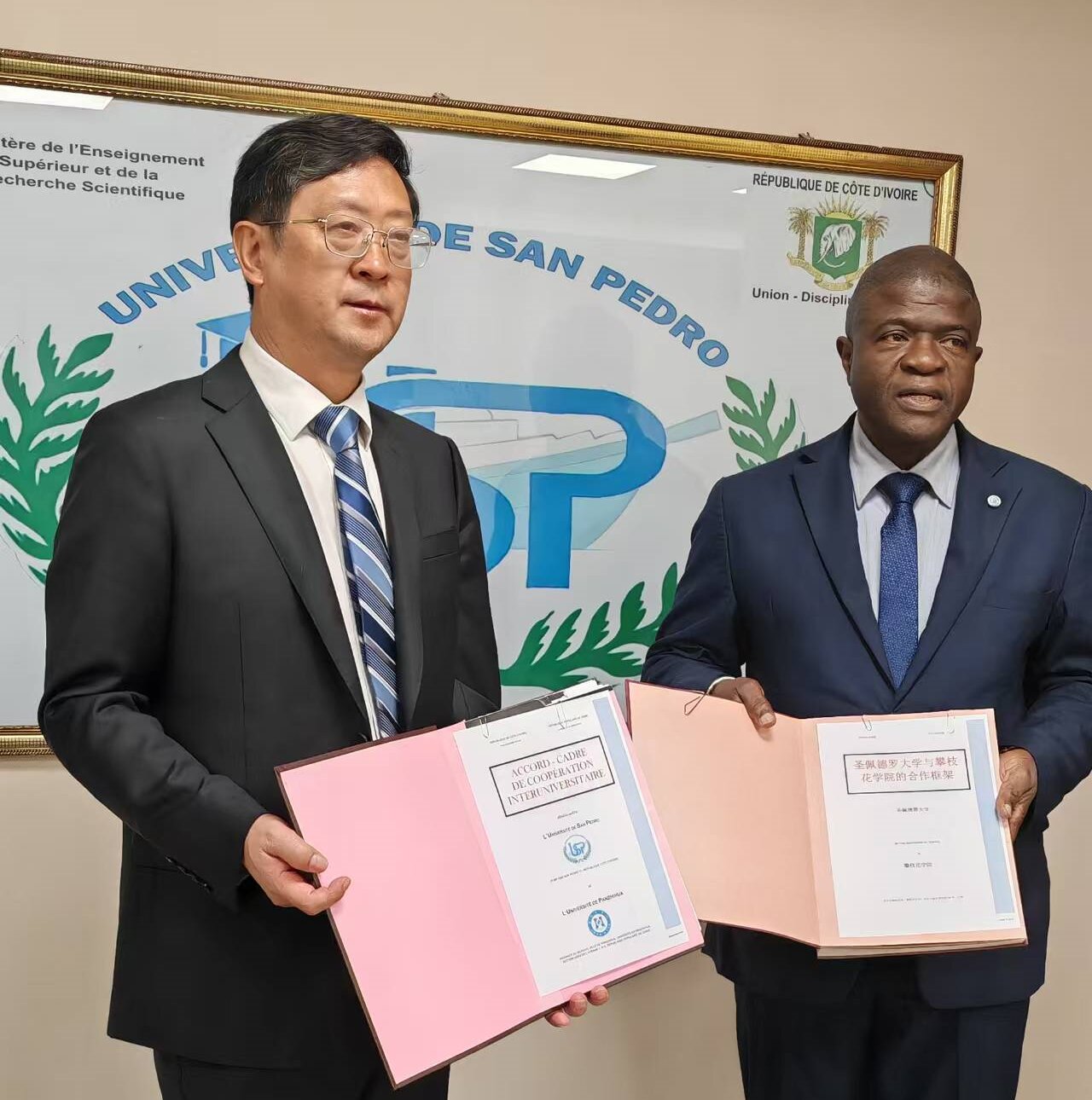 在科特迪瓦圣佩德罗理工大学,代表团受到了校长米特·梅克、副校长瓦塔拉·卡拉莫科、副校长夸库·艾马尔的热情接待,并与学校国际交流与合作处、学生处、教务处、农学院等部门相关负责人和汉语国际专业学生代表举行了深入交谈,通过两校师资、办学理念、内涵建设情况、校友等的介绍,双方最后达成师生互派、科研合作等意向,并现场签署了合作框架协议。