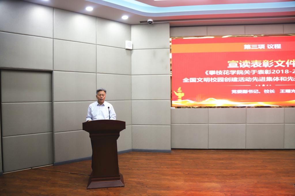 党委副书记、校长王曙光宣读《攀枝花学院关于表彰2018-2020年度全国文明校园创建活动先进集体和先进个人的决定》表彰文件。与会校领导、党委宣传部负责人分别为16个优秀文明单位、15个文明教研室、12个优秀文明班级、12个最佳文明寝室、2个文明食堂、4个优秀志愿服务站和39名创建工作先进个人颁奖。