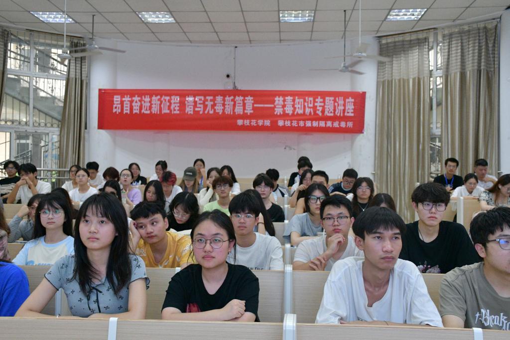 为提高全体师生防毒、拒毒、禁毒的意识,营造良好的校园禁毒氛围6月11日在第二教学楼开展“昂首奋进新征程,谱写无毒新篇章”禁毒知识专题讲座。本次讲座邀请到攀枝花市强制隔离戒毒所一级警长谭耀华进行专题教育宣讲。