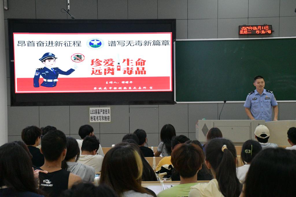 活动伊始,谭耀华围绕“毒品的危害性”、“禁毒法律法规”和“大学生如何防范毒品”三个方面展开讲解同时结合禁毒工作中鲜活案例,深入浅出地给学生论述和分析了毒品对个人、家庭和社会的危害以血的教训、铁的事实告诫学生们牢牢掌握禁毒知识,了解禁毒相关法律法规,增强法律意识树立正确价值观,培养良好的生活习惯,增强自我保护意识,自觉抵制毒品