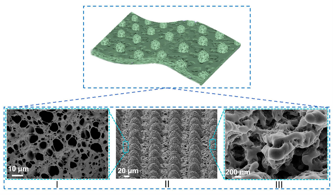 该成果将飞秒激光精密加工技术与模板转印方法相结合,制备出具有多孔半球型凸起微结构的聚二甲基硅氧烷薄膜和表面具有微结构的铜箔电极,并在此基础上成功构建了一种新型自供电压力传感器(PS-TENG)。该器件表面具有均匀分布的孔隙、周期性半球阵列及不规则纳米凸起,这种多尺度复合微纳结构显著提高了比表面积并降低了弹性模量,从而提升性能。进一步的有限元模拟揭示了结构尺寸与空间分布对器件形变及电荷转移效率的影响机制,理论分析结果与实验数据一致,验证了结构优化设计的合理性与有效性。实验结果表面PS-TENG获得高灵敏度(0.87 V kPa⁻¹)、宽检测范围(0.02–53.3 kPa)和快速响应速度(16.6 ms),该器件不仅在电学性能和长期稳定性方面表现出色,同时在复杂湿度环境下也展现出优异的环境适应性。